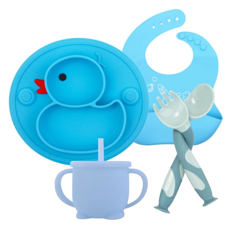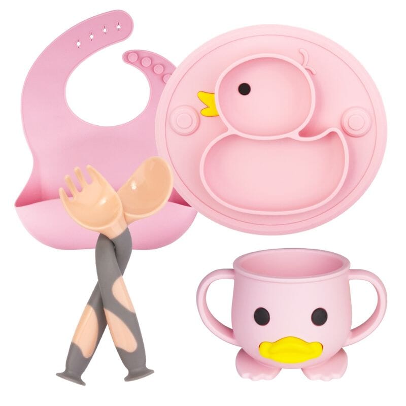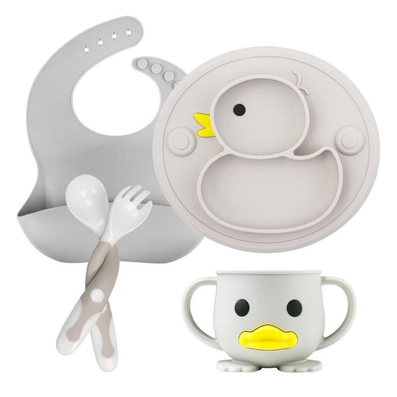 Ce kit comprend une assiette en forme de canard, un bavoir, une cuillère et une fourchette en silicone ainsi qu'un gobelet en silicone souple.
